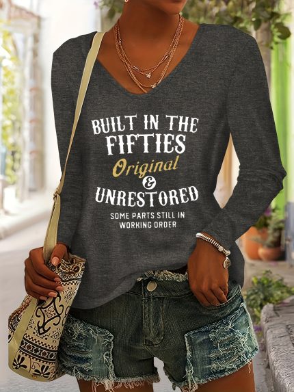 Women’S Letter Print Comfortable Perfect Casual Color V-neck Long Sleeve T-shirt | Autumn Winter Daily Versatile Fashion, Regular Fit, Hooded Collar