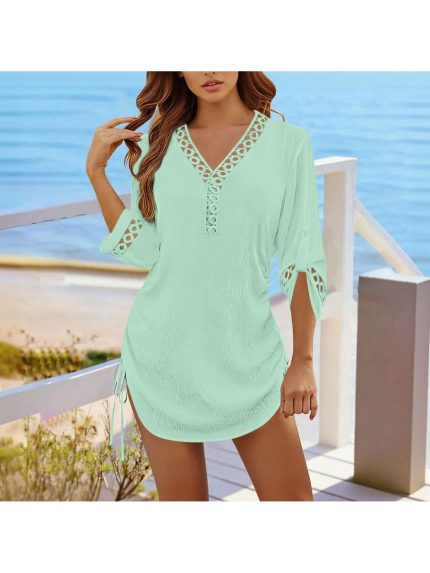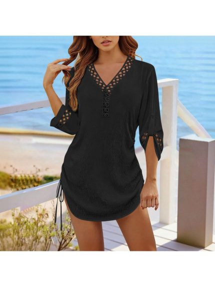 Women’s Solid Color V-Neck Casual Loose Long Tunic Top, Lace Decor 3u002F4 Sleeve with Drawstring Side Design for Summer Vacation, Beach Outings, Daily Wear, Lounge and Outdoor