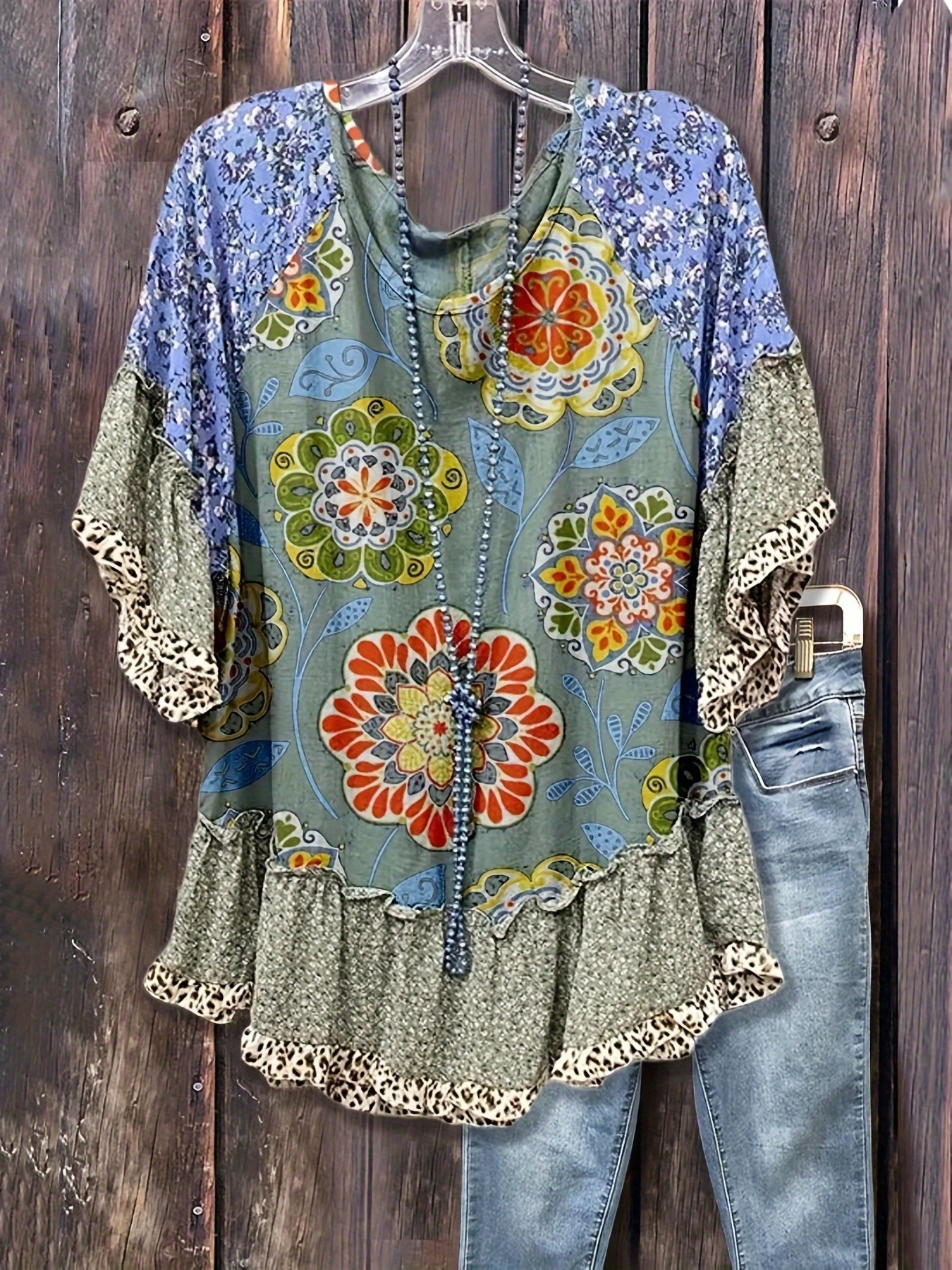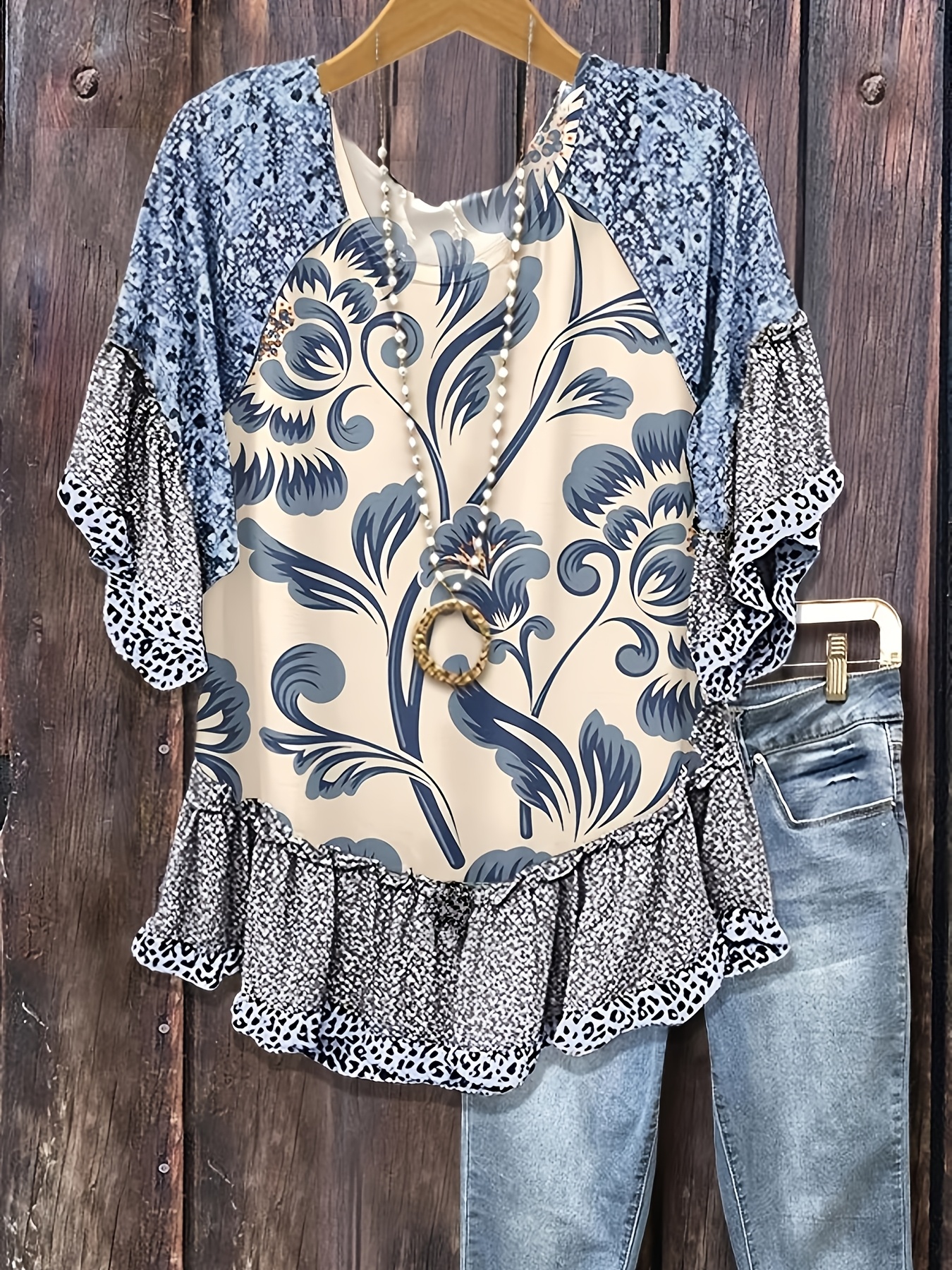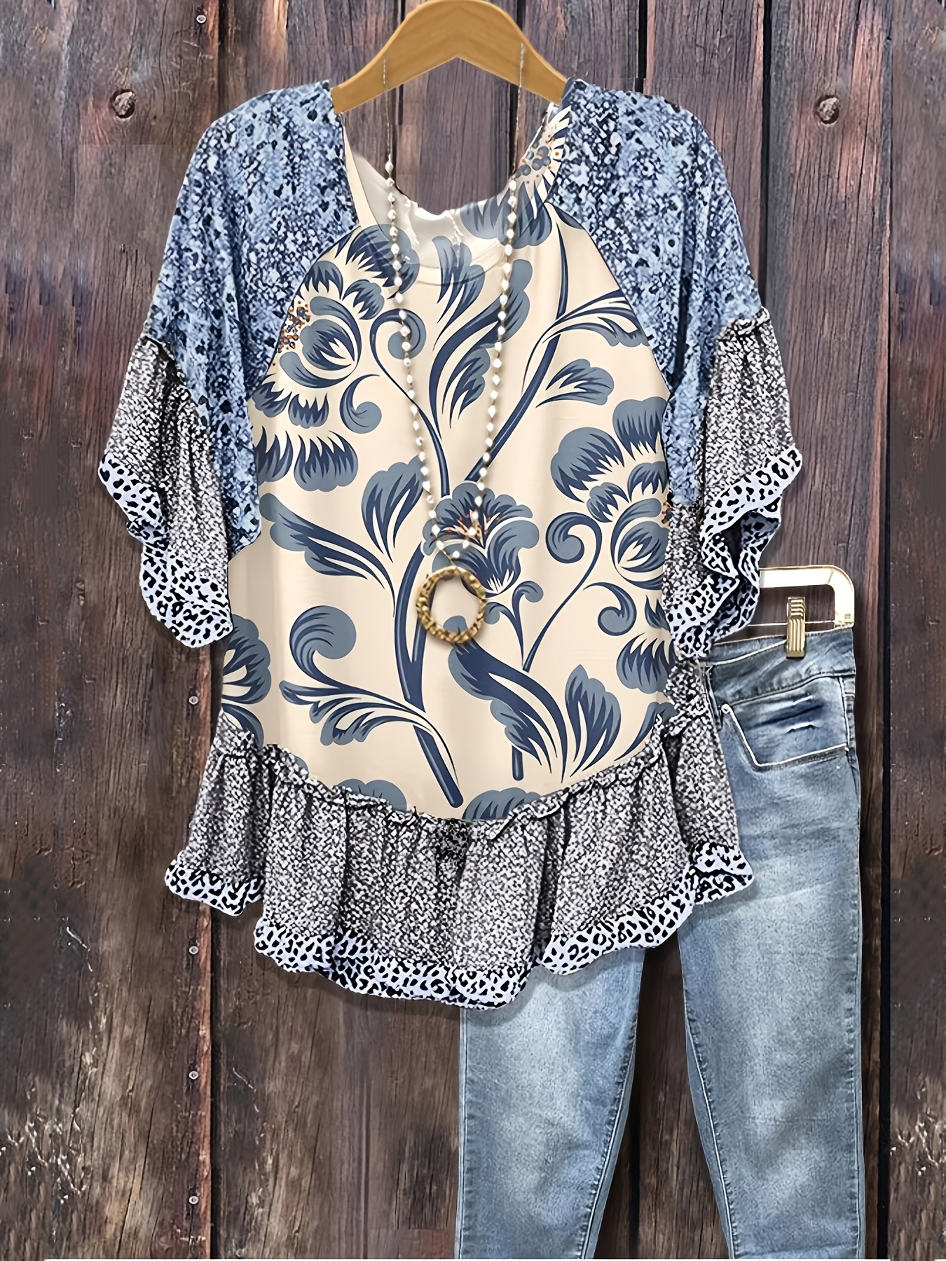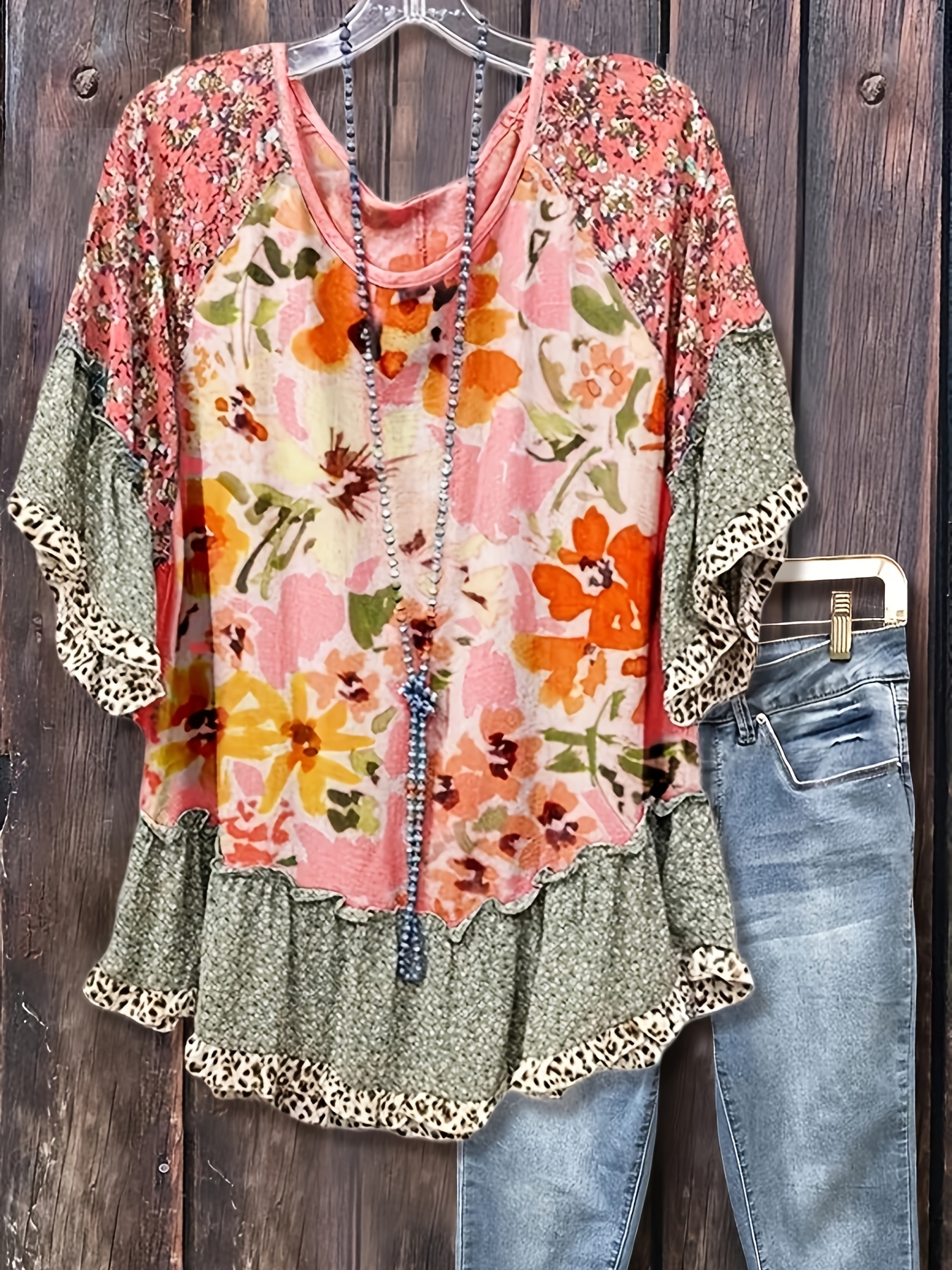 Mixed Floral Print Loose Top, Leopard Print Patchwork, Flared Three-quarter Sleeves, Women’s Clothing