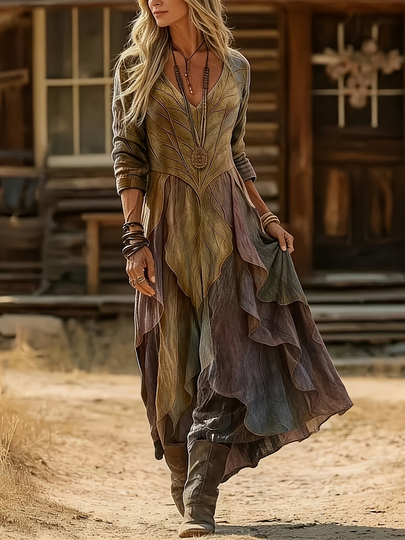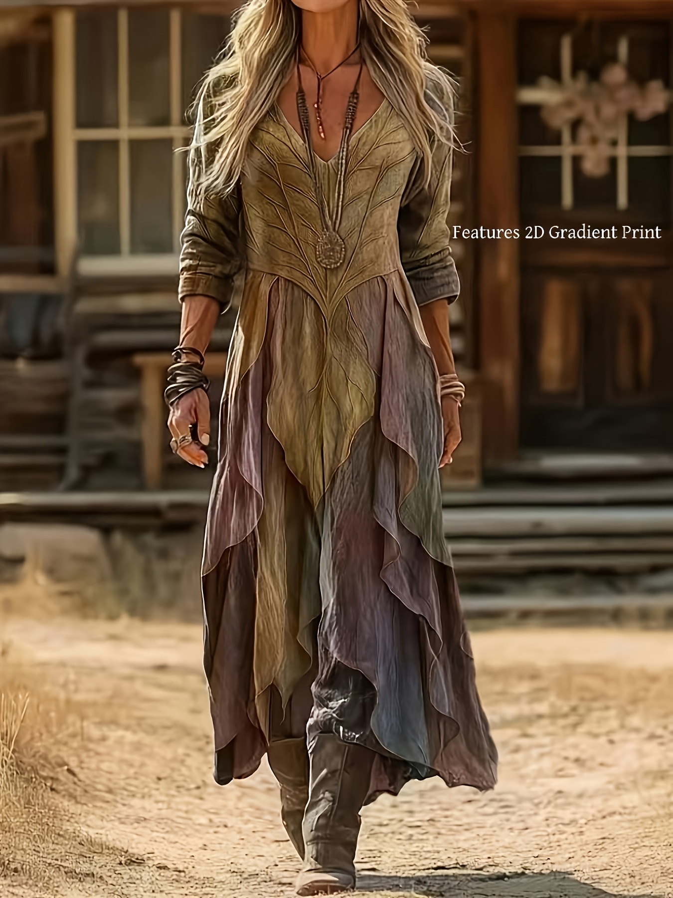 New Vintage Floral Art Print Dress – Casual Women’S Dress for Weddings And Parties, Long Skirt (The Folds And Layers Shown in The Image Are Printed Effects; The Actual Product Features a Flat Design)