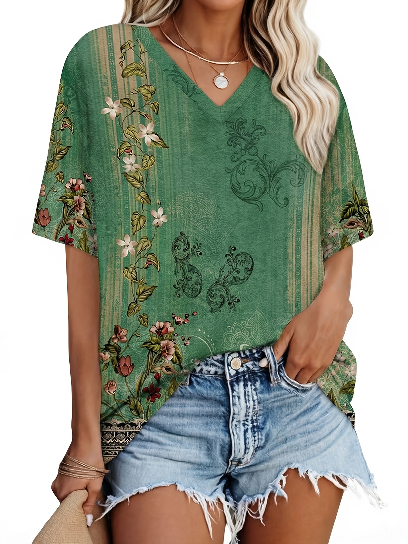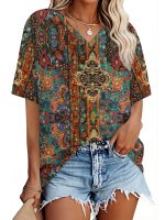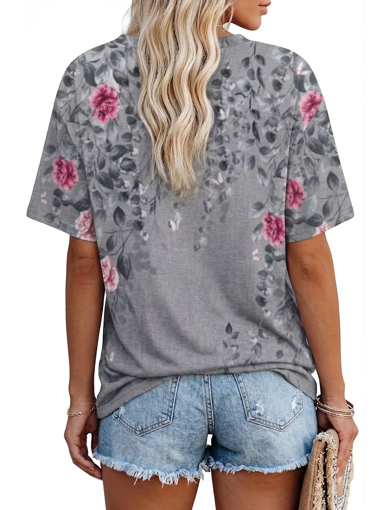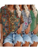 Women’s Fashion Vintage Dragonfly and Floral Print T-Shirt – Casual Rolled Sleeves, Notched V-Neck Top, Perfect for Spring and Summer