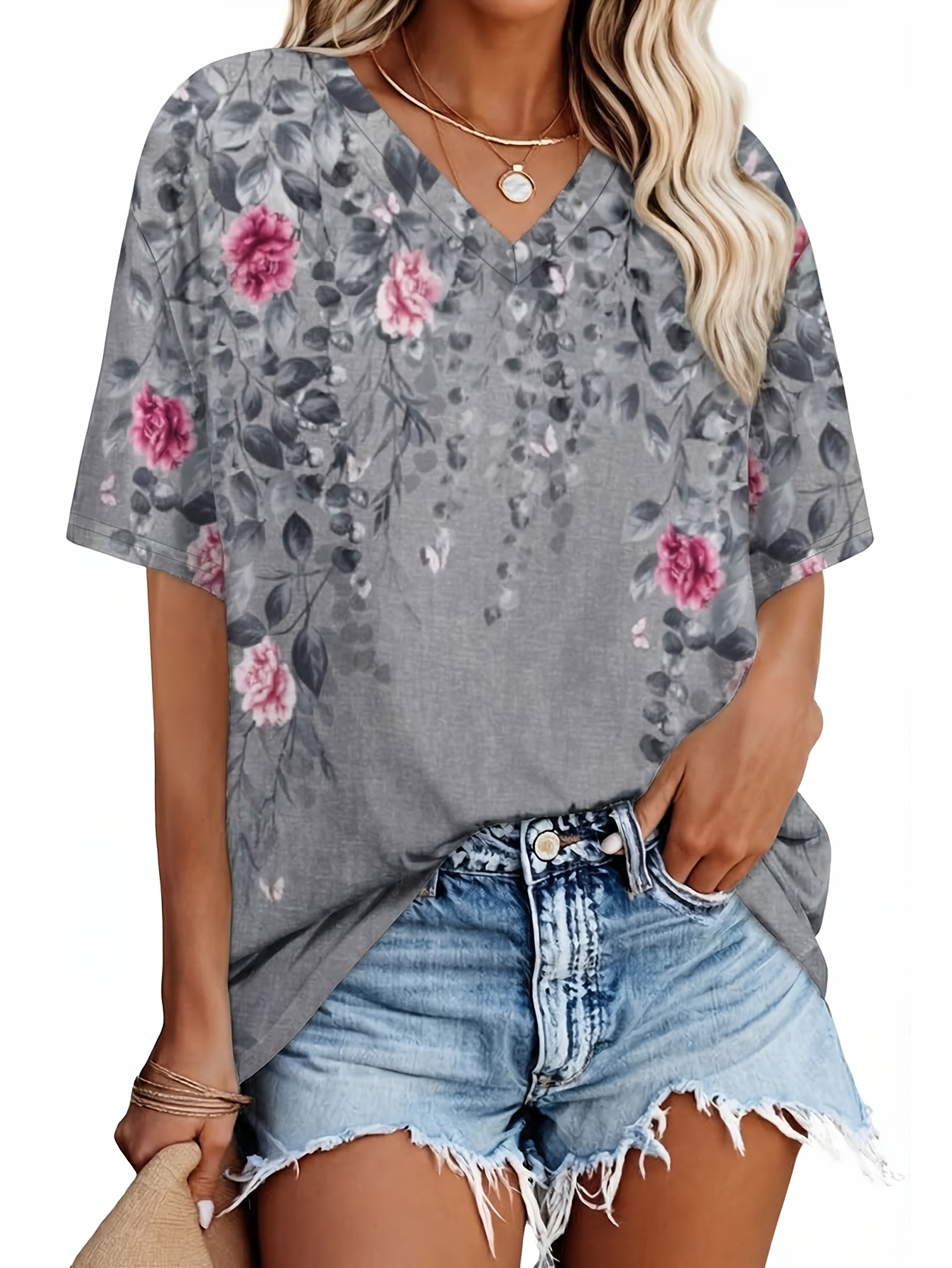 Home Women's T-Shirt Oversized 3pcs Set Women’s Fashionable and Elegant Loose-Fit Casual Basic V-Neck Short-Sleeve T-Shirt Top