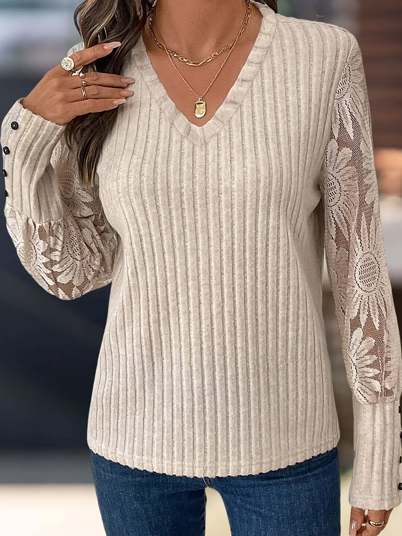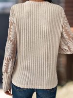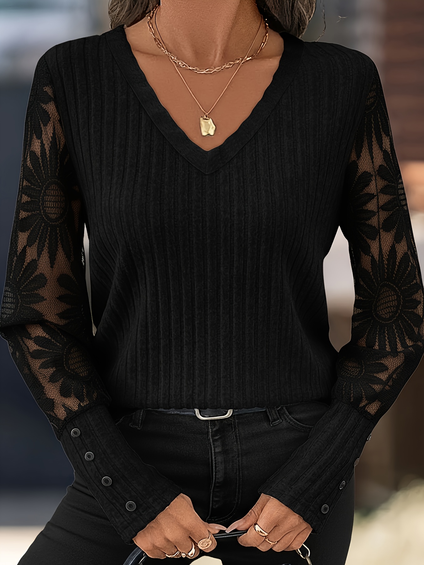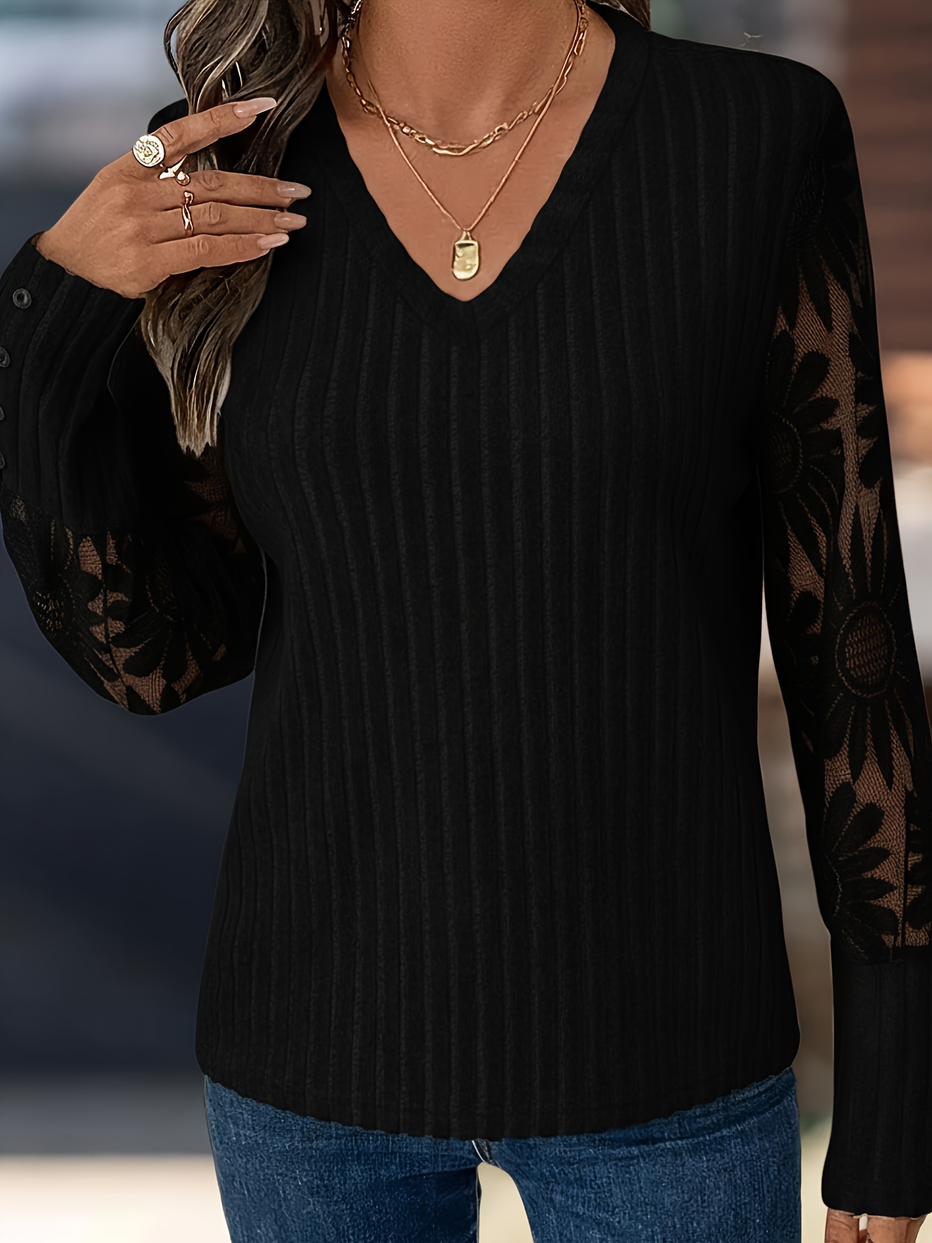Home Women's T-Shirt Ribbed Contrast Mesh Button Side V Neck Long Sleeve T-Shirt